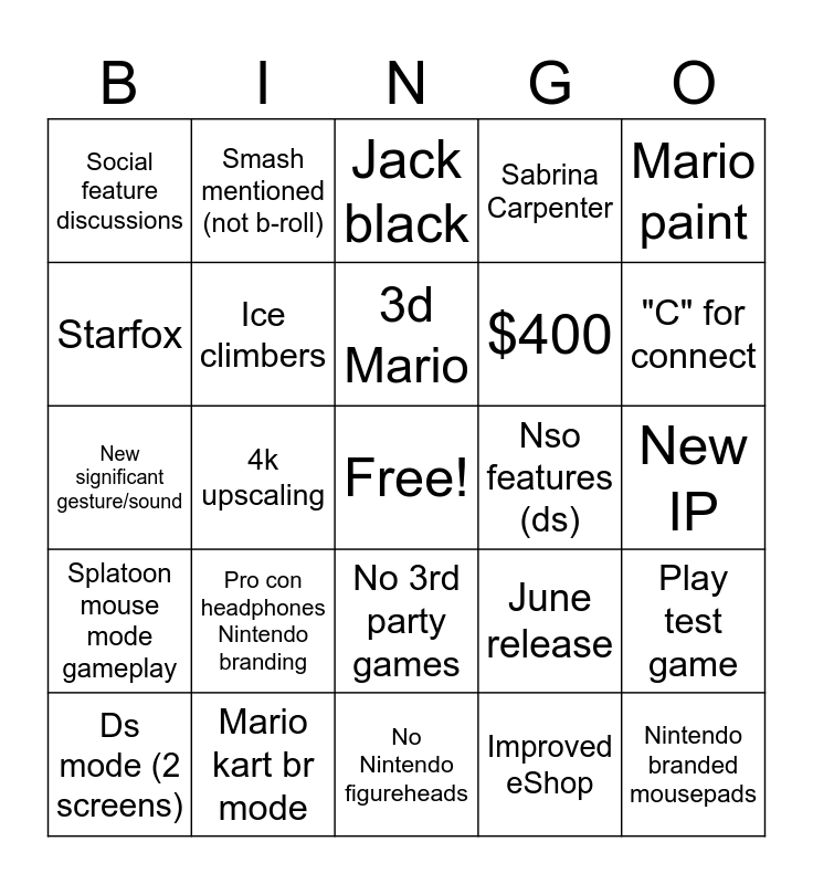 This bingo card has a free space and 24 words: Pro con headphones Nintendo branding, Mario kart br mode, 3d Mario, Ds mode (2 screens), Mario paint, Social feature discussions, Starfox, Smash mentioned (not b-roll), Nso features (ds), No 3rd party games, $400, New significant gesture/sound, June release, Play test game, Ice climbers, Improved eShop, New IP, Jack black, "C" for connect, 4k upscaling, Nintendo branded mousepads, Splatoon mouse mode gameplay, Sabrina Carpenter and No Nintendo figureheads.