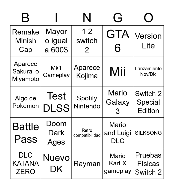 This bingo card has 30 words: Nuevo DK, Modo Mouse, Test DLSS, Smash 6, Remake Minish Cap, 1 2 switch 2, Mk1 Gameplay, Retro compatibilidad, Mario Galaxy 3, Rayman, Switch 2 Special Edition, Spotify Nintendo, Mario Kart X gameplay, Pruebas Físicas Switch 2, Lanzamiento Nov/Dic, Juego con modo mouse, Mario and Luigi DLC, Battle Pass, Doom Dark Ages, Version Lite, Algo de Pokemon, Nuevo Kirby, Mayor o igual a 600$, Mii, Aparece Sakurai o Miyamoto, GTA 6, SILKSONG, DLC KATANA ZERO, Aparece Kojima and Tiktok de Nintendo.