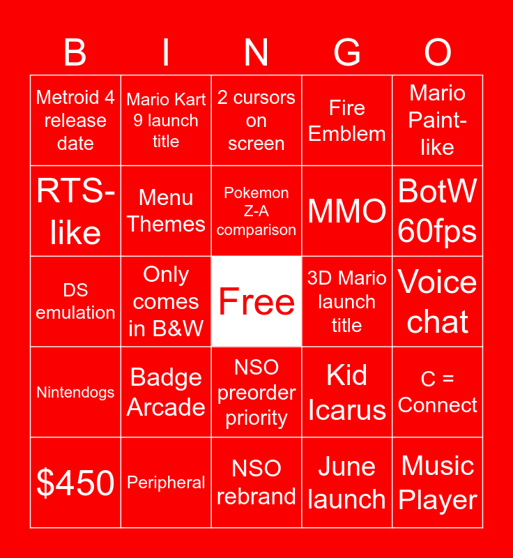This bingo card has a free space and 24 words: Badge Arcade, Peripheral, Pokemon Z-A comparison, $450, Mario Paint-like, Metroid 4 release date, RTS-like, Mario Kart 9 launch title, 3D Mario launch title, NSO preorder priority, MMO, DS emulation, Kid Icarus, C = Connect, Menu Themes, June launch, Voice chat, 2 cursors on screen, BotW 60fps, Only comes in B&W, Music Player, Nintendogs, Fire Emblem and NSO rebrand.