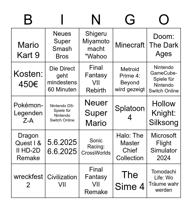 This bingo card has 25 words: 5.6.2025 6.6.2025, Final Fantasy VII Remake, Final Fantasy VII Rebirth, wreckfest 2, Doom: The Dark Ages, Mario Kart 9, Kosten: 450€, Neues Super Smash Bros, Splatoon 4, Sonic Racing: CrossWorlds, Metroid Prime 4: Beyond wird gezeigt, Pokémon-Legenden Z-A, Halo: The Master Chief Collection, Microsoft Flight Simulator 2024, Die Direct geht mindestens 60 Minuten, Tomodachi Life: Wo Träume wahr werden, Hollow Knight: Silksong, Shigeru Miyamoto macht "Wahoo, Nintendo GameCube-Spiele für Nintendo Switch Online, Nintendo DS-Spiele für Nintendo Switch Online, Neuer Super Mario, Civilization VII, Dragon Quest I & II HD-2D Remake, Minecraft and The Sime 4.