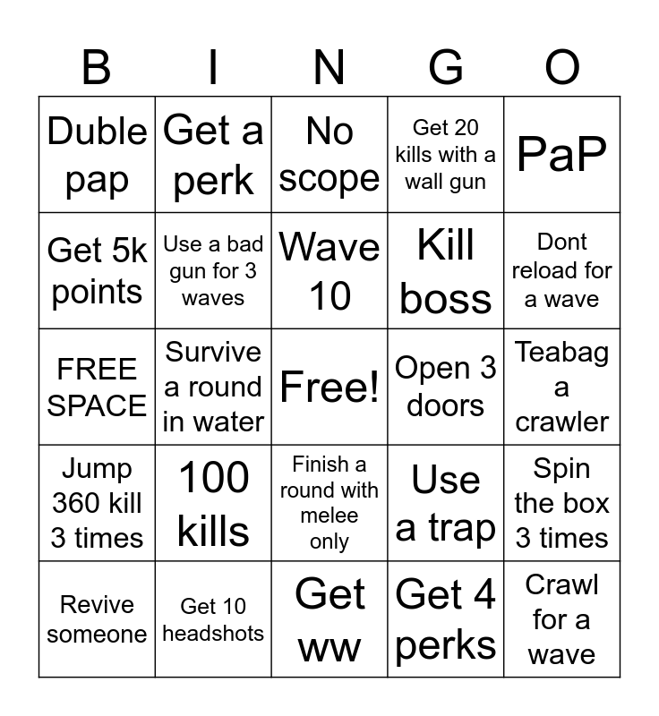 This bingo card has a free space and 25 words: 100 kills, Get ww, Wave 10, Revive someone, PaP, Duble pap, Get 5k points, Get a perk, Open 3 doors, Finish a round with melee only, Kill boss, FREE SPACE, Use a trap, Spin the box 3 times, Use a bad gun for 3 waves, 3 kill with grenade, Teabag a crawler, No scope, Dont reload for a wave, Survive a round in water, Crawl for a wave, Get 10 headshots, Jump 360 kill 3 times, Get 20 kills with a wall gun and Get 4 perks.