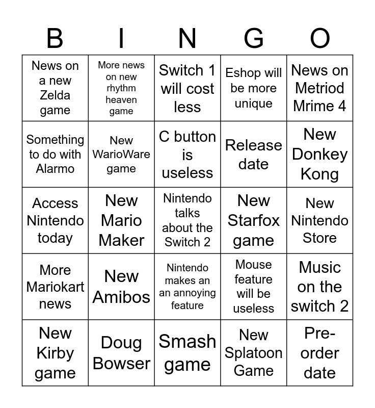 This bingo card has a free space and 54 words: New 3D Mario game, More Mariokart news, Game cards have a different design, Some switch 1 games will get a remaster, Nintendo makes an an annoying feature, New backrounds, Eshop will be more unique, Longer battery life, Something to do with Alarmo, Miis will be more useful, News on a new Zelda game, Shigeru Miyamoto, Doug Bowser, New Kirby game, Masahiro Sakurai, Smash game, Pre-order date, Release date, Talk about digital game cards, New Nintendo Store, Mouse feature will be useless, Home screen will have more life, New Starfox game, News on Metriod Mrime 4, More news on Pokemon Z-A, More news on new rhythm heaven game, More news on Tomidachi life 2, New Chibi-Robo, Nintendo switch online+ will have more things, New Splatoon Game, GTA 6 will release on Switch 2, Better photo mode, Pack-in game, New 1-2 Switch, Switch 1 will cost less, Access Nintendo music, Access Nintendo today, Music on the switch 2, New Amimal Crossing game, New WarioWare game, New Marion Strikers, Priceing on games will be $70.00, Shuntaro Furukawa, Reggie, New Amibos, New F-Zero, 1 hour and 30 min, Nintendo VR, C button is useless, New Mario Maker, New Donkey Kong, Get X-Box Exclusives, New Paper Mario and New Piloitwings.