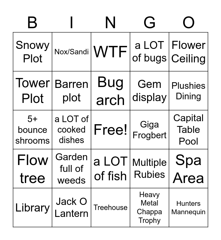 This bingo card has a free space and 35 words: Giant Ancient Fish Plush, New Plushie Plot, Potato Pod Shelf, Barren plot, a LOT of fish, a LOT of bugs, Tower Plot, Hanging signpost, Bug arch, Attic, 5+ bounce shrooms, Flower Ceiling, Tiny home, Maze/Obstacle Course, Snowy Plot, Giga Frogbert, Heavy Metal Chappa Trophy, a LOT of cooked dishes, Flow tree, Hunters Mannequin, Multiple Rubies, Library, Spa Area, Jack O Lantern, WTF, Plushies Dining, Wedding Venue, Cooking Party plot, Gem display, Capital Table Pool, NPC Shrine, Treehouse, Garden full of weeds, Nox/Sandi and 5+ RTB Plushes.