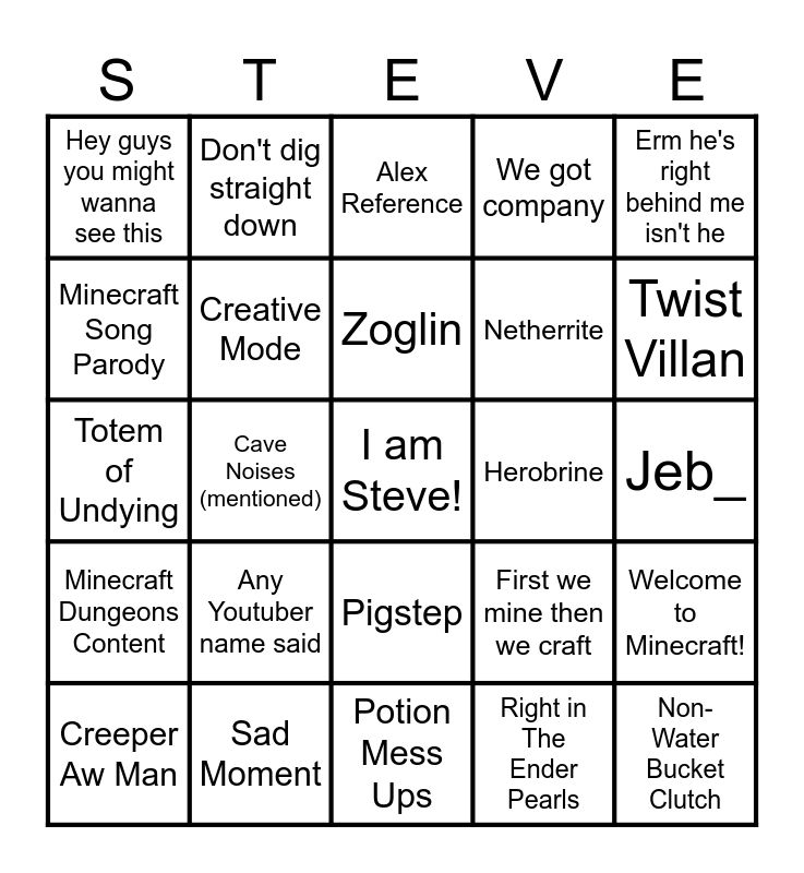This bingo card has a free space and 24 words: Creeper Aw Man, Any Youtuber name said, Zoglin, Right in The Ender Pearls, Erm he's right behind me isn't he, Hey guys you might wanna see this, Don't dig straight down, Alex Reference, Herobrine, Jeb_, Totem of Undying, Creative Mode, First we mine then we craft, Welcome to Minecraft!, Minecraft Song Parody, Sad Moment, Potion Mess Ups, We got company, Twist Villan, Minecraft Dungeons Content, Cave Noises (mentioned), Pigstep, Netherrite and Non-Water Bucket Clutch.