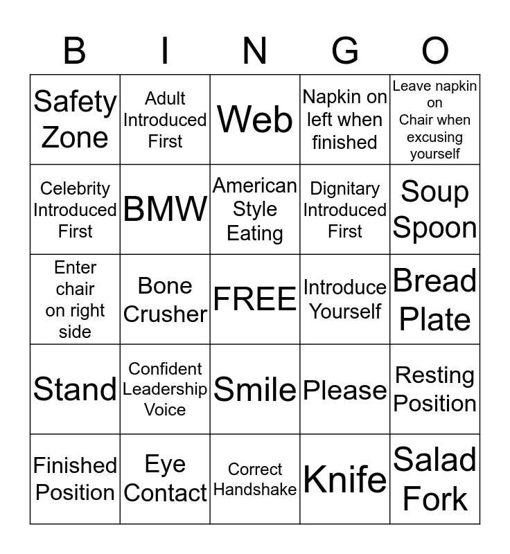 This bingo card has a free space and 30 words: Eye Contact, Stand, Bone Crusher, Glove Handshake, Safety Zone, Web, BMW, Smile, Introduce Yourself, Correct Handshake, Bread Plate, Salad Fork, Knife, Napkin, Soup Spoon, Thank You, Please, Stand, Confident Leadership Voice, Leave napkin on Chair when excusing yourself, Enter chair on right side, Gentleman Seats Lady seats Lady, Adult Introduced First, Dignitary Introduced First, Celebrity Introduced First, Napkin on left when finished, Resting Position, Finished Position, American Style Eating and Continental Style eating.