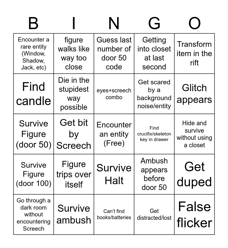 This bingo card has a free space and 29 words: Go through a dark room without encountering Screech, Survive Seek, Get bit by Screech, Use a crucifix, Encounter a rare entity (Window, Shadow, Jack, etc), Guess last number of door 50 code, Die in the stupidest way possible, Figure trips over itself, Find crucifix/skeleton key in drawer, Survive ambush, Hide and survive without using a closet, False flicker, Can’t find books/batteries, Get distracted/lost, Glitch appears, Collect at least 200 gold, Survive Halt, Survive Figure (door 100), Transform item in the rift, Survive Figure (door 50), Ambush appears before door 50, Reach courtyard, Get scared by a background noise/entity, Find candle, Getting into closet at last second, figure walks like way too close, Get duped, eyes+screech combo and Get scared a bit by a background noise.
