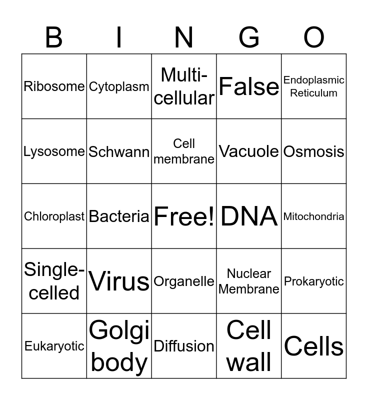 This bingo card has a free space and 26 words: Organelle, Cell wall, Cell membrane, Golgi body, Endoplasmic Reticulum, Ribosome, Lysosome, Cytoplasm, Mitochondria, Nuclear Membrane, Vacuole, Chloroplast, Prokaryotic, Eukaryotic, Bacteria, True, False, Single-celled, Multi-cellular, Cells, Osmosis, Diffusion, DNA, Virus, Schwann and Hooke.