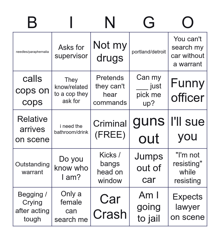 This bingo card has a free space and 93 words: Call my.., No ID, Car Crash, Are you going to arrest me?, Tased, hobbled,or spitmask, Kids present, I have to go to work tomorrow, Begging / Crying after acting tough, The cuffs are too tight, Does sobriety test, Assulting officer, But I have kids, Don't tow my car, Can my ___ just pick me up?, I've had nothing to drink, You can't search my car without a warrant, Not my drugs, You are hurting me, This is illegal, Claims entrapment / profiling, Flees / Resisting, It's in Illinois or Florida, I have rights, I know the law, Do you know who I am?, They know/related to a cop they ask for, You didn't read me my rights, Insults cops, History / known to cops, I can't breathe, Only a female can search me, Kicks / bangs head on window, Screams incoherently, Asks for badge number, Asks for supervisor, I don't answer questions, "sovereign citizen" nonsense, Am I being detained, Pretends they can't hear commands, Jumps out of car, Relative arrives on scene, Outstanding warrant, I'll sue you, You're going to lose your job, Expects lawyer on scene, Calls someone during stop, That's not mine, Repeats the same thing continuously, Claims mental disorder, I live nearby/over there, I'm scared, Am I going to jail, Lies about name, Aren't there more important crimes, I do not consent, Tries to order the cops around, Refuses to get in squad car, I just want to go home, Can't answer simple questions, i didnt do anything, i need the bathroom/drink, you're not allowed to touch me, screaming (no words), tased, flirts, "I have kids", "Police brutality", ragdoll, calls cops on cops, florida/wisconsin, bite/spit, "right to remain silent" *keeps talking*, talkative bystander, portland/detroit, repeats anything more than 3x, "I'm gonna record you", Funny officer, "I'm not resisting" while resisting, mentions anything about a powertrip, slur, racism, you cant make me leave/shut up. this is a free country, guns out, needles/paraphernalia, suspect develops medical condition, shots fired, sexual comment, therapist cop, crying, cursing, "you cant..." / "you dont have the right to...", hot female cop and hot male cop.