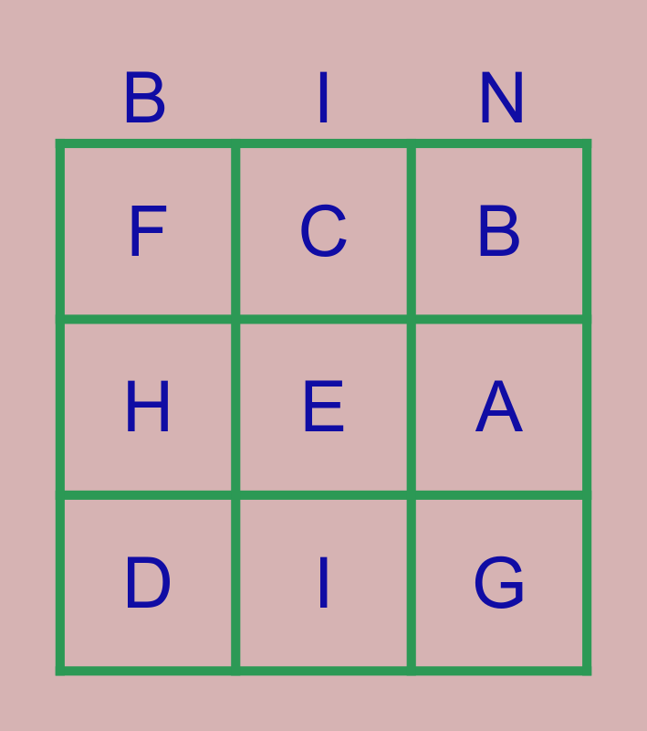 This bingo card has a free space and 8 words: A, B, C, D, F, G, H and I.
