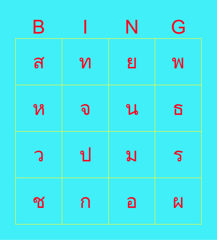 This bingo card has 16 words: ก, ร, ย, ส, ว, ท, ม, อ, ห, จ, ช, พ, ป, ธ, น and ผ.