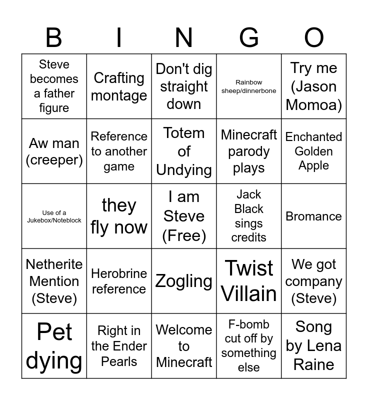 This bingo card has a free space and 24 words: Herobrine reference, Right in the Ender Pearls, Totem of Undying, Pet dying, Try me (Jason Momoa), Steve becomes a father figure, Aw man (creeper), Crafting montage, Jack Black sings credits, Zogling, Minecraft parody plays, Use of a Jukebox/Noteblock, Twist Villain, We got company (Steve), Reference to another game, F-bomb cut off by something else, Bromance, Don't dig straight down, Enchanted Golden Apple, they fly now, Song by Lena Raine, Netherite Mention (Steve), Rainbow sheep/dinnerbone and Welcome to Minecraft.