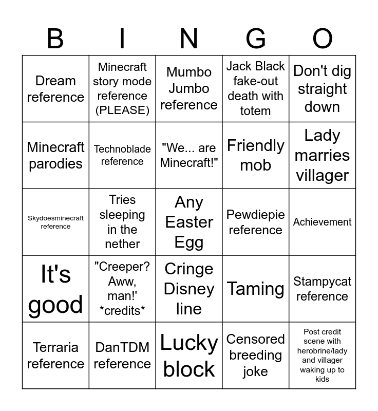 This bingo card has a free space and 24 words: "Creeper? Aww, man!' *credits*, DanTDM reference, "We... are Minecraft!", Terraria reference, Don't dig straight down, Dream reference, Minecraft parodies, Minecraft story mode reference (PLEASE), Pewdiepie reference, Cringe Disney line, Friendly mob, Skydoesminecraft reference, Taming, Stampycat reference, Technoblade reference, Censored breeding joke, Achievement, Mumbo Jumbo reference, Lady marries villager, Tries sleeping in the nether, Post credit scene with herobrine/lady and villager waking up to kids, It's good, Jack Black fake-out death with totem and Lucky block.