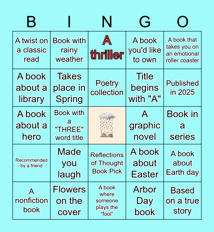This bingo card has a free space and 24 words: Made you laugh, Flowers on the cover, Poetry collection, A nonfiction book, A book that takes you on an emotional roller coaster, A twist on a classic read, A book about a library, Book with rainy weather, A graphic novel, Reflections of Thought Book Pick, Title begins with "A", A book about a hero, A book about Easter, A book about Earth day, Takes place in Spring, Arbor Day book, Book in a series, A thriller, Published in 2025, Book with a "THREE" word title, Based on a true story, Recommended by a friend, A book you'd like to own and A book where someone plays the “fool”.