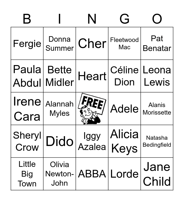 This bingo card has a free space and 76 words: Britney Spears, Shania Twain, Cher, Macy Gray, Jennifer Lopez, Sarah McLachlan, Lauryn Hill, Janet Jackson, Wilson Phillips, Mariah Carey, Roxette, Sinéad O'Connor, Heart, Paula Abdul, En Vogue, Alannah Myles, Lisa Stansfield, Jane Child, Diana Ross, Pat Benatar, Blondie, Irene Cara, Bette Midler, Donna Summer, Fleetwood Mac, The Pointer Sisters, Whitney Houston, Madonna, Sade, Katy Perry, P!nk, Rihanna, Taylor Swift, Alicia Keys, Leona Lewis, Céline Dion, Natalie Imbruglia, Jennifer Paige, Alanis Morissette, Lorde, Icona Pop, Miley Cyrus, Kesha, Demi Lovato, Elle King, Rachel Platten, Little Big Town, Fergie, Gwen Stefani, Colbie Caillat, Meghan Trainor, Iggy Azalea, Jessie J, Ariana Grande & Nicki Minaj, Nicki Minaj, Ariana Grande, Sia, Beyoncé, Paramore, Christina Aguilera, Ashanti, Dido, Lumidee, Christina Milian, Nina Sky, Paula Cole, Spice Girls, Adele, Carly Rae Jepsen, Amy Winehouse, Lady Gaga, Natasha Bedingfield, Sheryl Crow, Olivia Newton-John, The Pussycat Dolls & Busta Rhymes, ABBA and Monica.