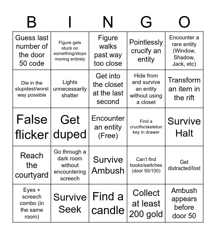 This bingo card has a free space and 24 words: Go through a dark room without encountering screech, Survive Seek, Get into the closet at the last second, Eyes + screech combo (in the same room), Encounter a rare entity (Window, Shadow, Jack, etc), Guess last number of the door 50 code, Die in the stupidest/worst way possible, Figure gets stuck on something/stops moving entirely, Find a crucifix/skeleton key in drawer, Survive Ambush, Hide from and survive an entity without using a closet, False flicker, Can’t find books/switches (door 50/100), Get distracted/lost, Lights unnecessarily shatter, Collect at least 200 gold, Survive Halt, Figure walks past way too close, Transform an item in the rift, Get duped, Ambush appears before door 50, Reach the courtyard, Pointlessly crucify an entity and Find a candle.