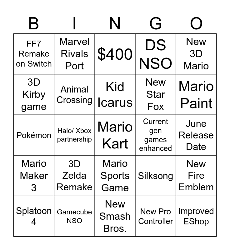 This bingo card has a free space and 24 words: 3D Zelda Remake, Gamecube NSO, Kid Icarus, Splatoon 4, New 3D Mario, FF7 Remake on Switch, 3D Kirby game, Marvel Rivals Port, Current gen games enhanced, Mario Sports Game, New Star Fox, Pokémon, Silksong, New Fire Emblem, Animal Crossing, New Pro Controller, June Release Date, $400, Mario Paint, Halo/ Xbox partnership, Improved EShop, Mario Maker 3, DS NSO and New Smash Bros..