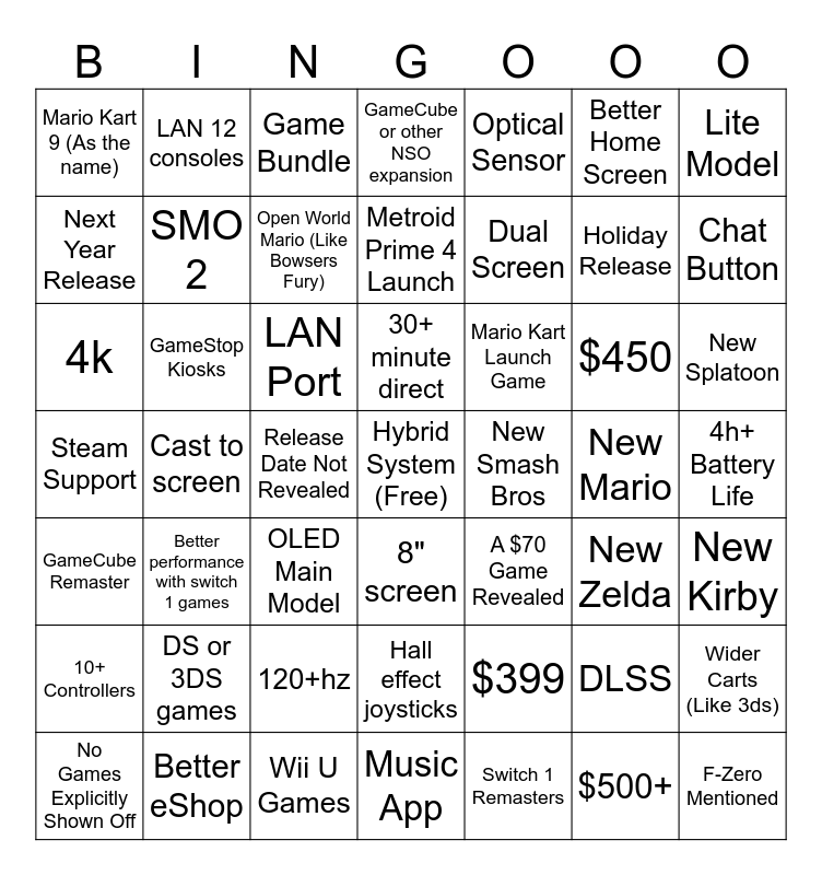 This bingo card has a free space and 48 words: $399, Holiday Release, Music App, Cast to screen, LAN Port, 4h+ Battery Life, LAN 12 consoles, Better eShop, Better Home Screen, 8" screen, Lite Model, GameCube or other NSO expansion, $450, Mario Kart Launch Game, 10+ Controllers, New Mario, Next Year Release, Chat Button, DLSS, Optical Sensor, Dual Screen, Release Date Not Revealed, Mario Kart 9 (As the name), SMO 2, Wider Carts (Like 3ds), Open World Mario (Like Bowsers Fury), New Splatoon, No Games Explicitly Shown Off, 30+ minute direct, GameStop Kiosks, $500+, New Smash Bros, New Kirby, DS or 3DS games, Steam Support, A $70 Game Revealed, New Zelda, 4k, OLED Main Model, 120+hz, GameCube Remaster, F-Zero Mentioned, Game Bundle, Wii U Games, Metroid Prime 4 Launch, Hall effect joysticks, Better performance with switch 1 games and Switch 1 Remasters.