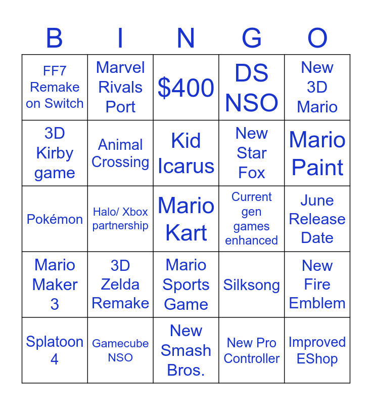 This bingo card has a free space and 24 words: 3D Zelda Remake, Gamecube NSO, Kid Icarus, Splatoon 4, New 3D Mario, FF7 Remake on Switch, 3D Kirby game, Marvel Rivals Port, Current gen games enhanced, Mario Sports Game, New Star Fox, Pokémon, Silksong, New Fire Emblem, Animal Crossing, New Pro Controller, June Release Date, $400, Mario Paint, Halo/ Xbox partnership, Improved EShop, Mario Maker 3, DS NSO and New Smash Bros..