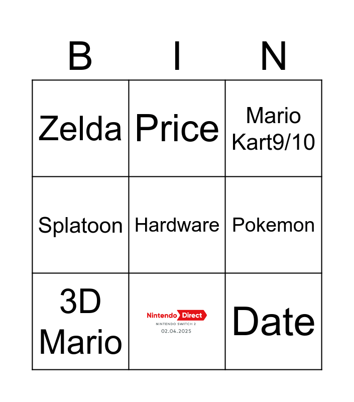 This bingo card has 1 images, a free space and 8 words: 3D Mario, Mario Kart9/10, Price, Splatoon, Zelda, Pokemon, Date and Tomodachi life.