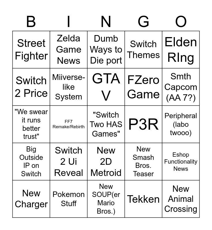 This bingo card has a free space and 48 words: Mario Kart 9 news, New Animal Crossing, New 3d Mario, New SOUP(er Mario Bros.), Switch 2 Ui Reveal, Release Date, Zelda Game News, Zelda Movie News, Switch 2 Price, C Button Reveal, Miiverse-like System, Switch Themes, Eshop Functionality News, New Smash Bros. Teaser, Kid Icarus Remaster/Remake, Port of Old Game, GTA V, P3R, P4R, Elden RIng, FF7 Remake/Rebirth, Tekken, Street Fighter, FZero Game, No Fzero Game, Smth Capcom (AA 7?), New Charger, Arms 2, New 2D Metroid, Big Outside IP on Switch, "Switch TWO has Games", Nintendo Music App stuff, Farming Sim lfgggg, Smth with Magnets, Pokemon Stuff, Pre-Order Edition, NO news about Drift, Peripheral (labo twooo), KH4 somehow, Hoyoverse, It tells you it loves you, Can fit in small box, Dumb Ways to Die port, Overview of Switch 2 parts, "We swear it runs better trust", Switch 2 murders Switch 1, "Sponsored by Raycon-" and Marvel stuff idk.
