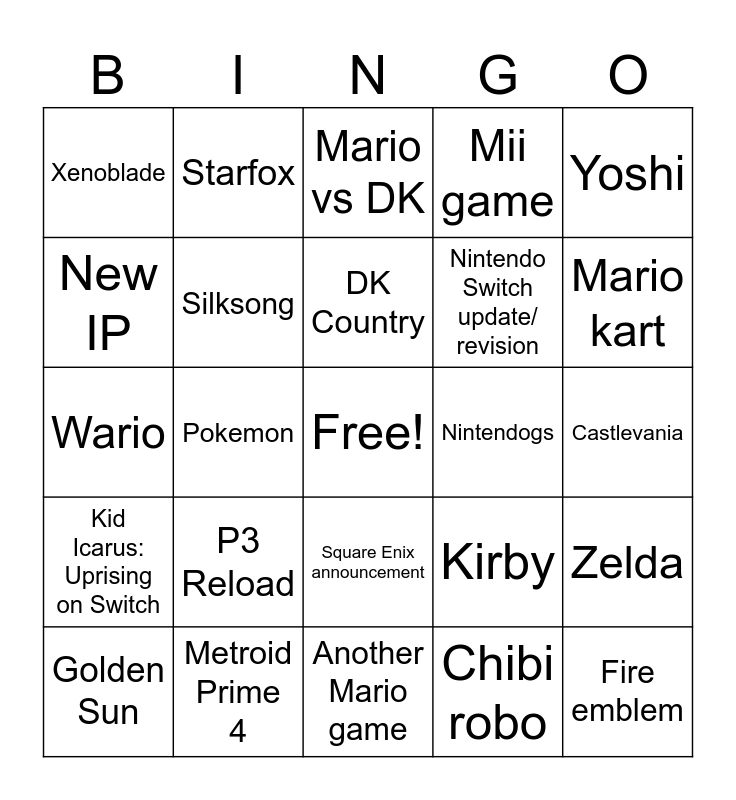 This bingo card has a free space and 24 words: P3 Reload, Metroid Prime 4, DK Country, Golden Sun, Yoshi, Xenoblade, New IP, Starfox, Nintendogs, Square Enix announcement, Nintendo Switch update/ revision, Wario, Kirby, Zelda, Silksong, Chibi robo, Castlevania, Mario vs DK, Mario kart, Pokemon, Fire emblem, Kid Icarus: Uprising on Switch, Mii game and Another Mario game.