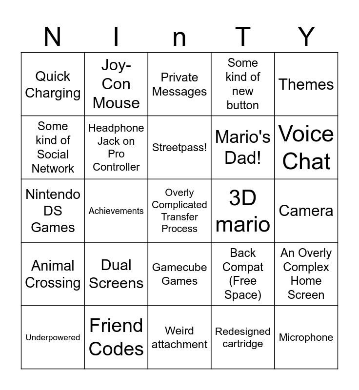 This bingo card has 25 words: Dual Screens, Weird attachment, Streetpass!, Underpowered, Themes, Quick Charging, Some kind of Social Network, Joy-Con Mouse, 3D mario, Gamecube Games, Mario's Dad!, Nintendo DS Games, Back Compat (Free Space), An Overly Complex Home Screen, Headphone Jack on Pro Controller, Microphone, Camera, Private Messages, Voice Chat, Achievements, Overly Complicated Transfer Process, Friend Codes, Animal Crossing, Some kind of new button and Redesigned cartridge.