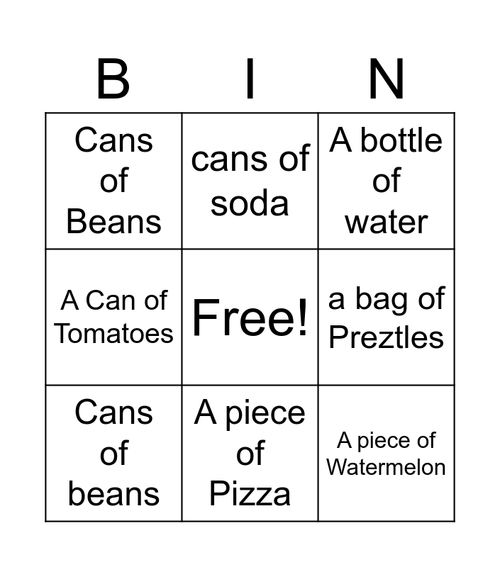 This bingo card has a free space and 14 words: A bag of pretzels, A bag of potato chips, Cans of beans, cans of soda, A Can of Tomatoes, A piece of Watermelon, A bottle of water, a piece of pizza, A piece of Pizza, Cans of Beans, A bag of potato chips, a bag of Preztles, A bottle of water and Cans of Soda.