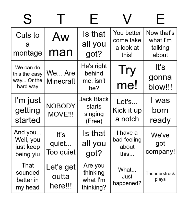 This bingo card has a free space and 24 words: It's quiet... Too quiet, Let's get outta here!!!, He's right behind me, isn't he?, That sounded better in my head, Now that's what I'm talking about, Cuts to a montage, We can do this the easy way... Or the hard way, Aw man, Let's... Kick it up a notch, Is that all you got?, Try me!, I'm just getting started, I have a bad feeling about this..., We've got company!, We... Are Minecraft, What... Just happened?, I was born ready, Is that all you got?, It's gonna blow!!!, NOBODY MOVE!!!, Thunderstruck plays, And you... Well, you just keep being yiu, You better come take a look at this! and Are you thinking what I'm thinking?.
