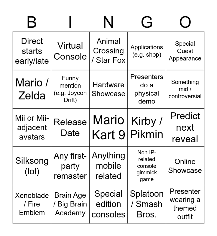 This bingo card has a free space and 24 words: Any first-party remaster, Brain Age / Big Brain Academy, Hardware Showcase, Xenoblade / Fire Emblem, Special Guest Appearance, Direct starts early/late, Mario / Zelda, Virtual Console, Kirby / Pikmin, Anything mobile related, Presenters do a physical demo, Mii or Mii-adjacent avatars, Non IP-related console gimmick game, Online Showcase, Funny mention (e.g. Joycon Drift), Splatoon / Smash Bros., Predict next reveal, Animal Crossing / Star Fox, Something mid / controversial, Release Date, Presenter wearing a themed outfit, Silksong (lol), Applications (e.g. shop) and Special edition consoles.