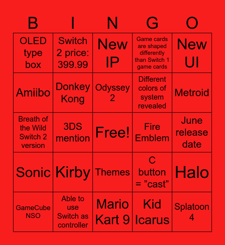 This bingo card has a free space and 24 words: GameCube NSO, Kirby, Odyssey 2, Kid Icarus, New UI, OLED type box, Switch 2 price: 399.99, New IP, Fire Emblem, June release date, Breath of the Wild Switch 2 version, Donkey Kong, C button = ”cast”, Halo, Amiibo, Able to use Switch as controller, Mario Kart 9, Game cards are shaped differently than Switch 1 game cards, Metroid, Sonic, 3DS mention, Themes, Different colors of system revealed and Splatoon 4.
