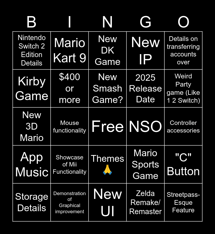 This bingo card has a free space and 24 words: Showcase of Mii Functionality, Demonstration of Graphical improvement, New Smash Game?, Storage Details, Details on transferring accounts over, Nintendo Switch 2 Edition Details, Kirby Game, Mario Kart 9, NSO, Themes🙏, 2025 Release Date, New 3D Mario, Mario Sports Game, "C" Button, $400 or more, Zelda Remake/ Remaster, Controller accessories, New DK Game, Weird Party game (Like 1 2 Switch), Mouse functionality, Streetpass-Esque Feature, App Music, New IP and New UI.