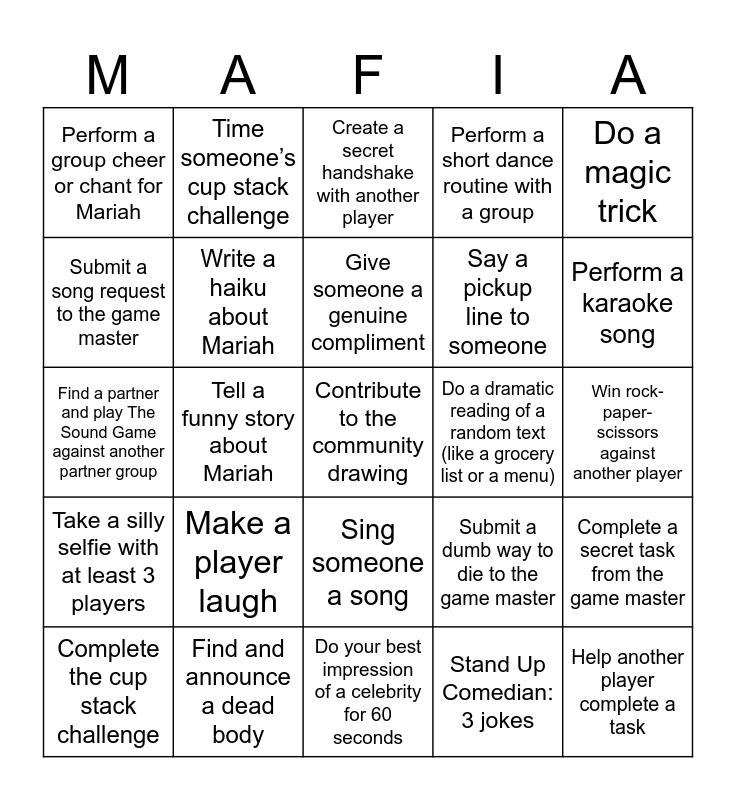 This bingo card has a free space and 41 words: Find a group and play a few rounds of Incohearent, Find a partner and play The Sound Game against another partner group, Write a haiku about another player and give it to them, Write a haiku about Mariah, Find and announce a dead body, Sing someone a song, Give someone a genuine compliment, Show someone your best party trick, Do a magic trick, Take a silly selfie with at least 3 players, Tell a funny story about Mariah, Perform a short dance routine with a group, Help another player complete a task, Win rock-paper-scissors against another player, Do a dramatic reading of a random text (like a grocery list or a menu), Make a player laugh, Do an impression of another player; group guesses who it is, Perform a group cheer or chant for Mariah, Write down the first three words that come to mind when you think of a player, and hand it to them, Create a secret handshake with another player, Complete a secret task from the game master, Tell someone about an embarrassing moment of yours, Do your best impression of a celebrity for 60 seconds, Say a pickup line to someone, Call a town hall meeting to expose the mafia, Act out a scene from Twilight, Stand Up Comedian: 3 jokes, Act out a scene from a Wayans Brother movie, Perform a karaoke song, Complete the Cookie Face challenge, Witness someone complete Cookie Face challenge, Time someone’s cup stack challenge, Complete the cup stack challenge, Gift someone a written affirmation or blessing, Submit a dumb way to die to the game master, Submit a song request to the game master, Make someone a drink, Send 3 candid party photos to the game master, Create an origami decoration, Successfully guess someone’s picture in Pictionary and Draw a caricature of another player.