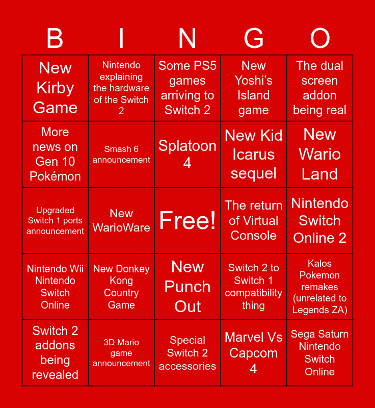 This bingo card has a free space and 24 words: New Donkey Kong Country Game, 3D Mario game announcement, Splatoon 4, Switch 2 addons being revealed, The dual screen addon being real, New Kirby Game, More news on Gen 10 Pokémon, Nintendo explaining the hardware of the Switch 2, The return of Virtual Console, New Punch Out, New Kid Icarus sequel, Upgraded Switch 1 ports announcement, Switch 2 to Switch 1 compatibility thing, Kalos Pokemon remakes (unrelated to Legends ZA), Smash 6 announcement, Marvel Vs Capcom 4, Nintendo Switch Online 2, Some PS5 games arriving to Switch 2, New Wario Land, New WarioWare, Sega Saturn Nintendo Switch Online, Nintendo Wii Nintendo Switch Online, New Yoshi’s Island game and Special Switch 2 accessories.