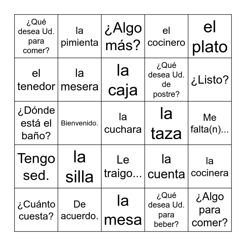 This bingo card has 50 words: el azúcar, la cuchara, el cuchillo, la mesa, la silla, la sal, la pimienta, el vaso, el tenedor, el mesero, la mesera, el cocinero, la cocinera, la cuenta, el menú del día, el dinero, la caja, la taza, la servilleta, el plato, Bienvenido., ¿Qué desea Ud. para beber?, ¿Qué desea Ud. para comer?, ¿Qué desea Ud. de postre?, ¿Algo para beber?, ¿Algo para comer?, ¿Listo?, Aquí está(n)..., ¿Algo más?, Le traigo..., ¿Todo está bien?, ¿Cómo está la comida?, ¿Cómo está todo?, ¿Necesita(n) algo?, De acuerdo., Un momento, por favor., ahora, Gracias por venir., Me gustaría..., Me falta(n)..., Necesito..., Quiero..., ¿Me trae...?, ¿Puedo tener más...?, ¿Cuánto cuesta?, ¿Dónde está el baño?, Perdón., Tengo hambre., Tengo sed. and muchas gracias.