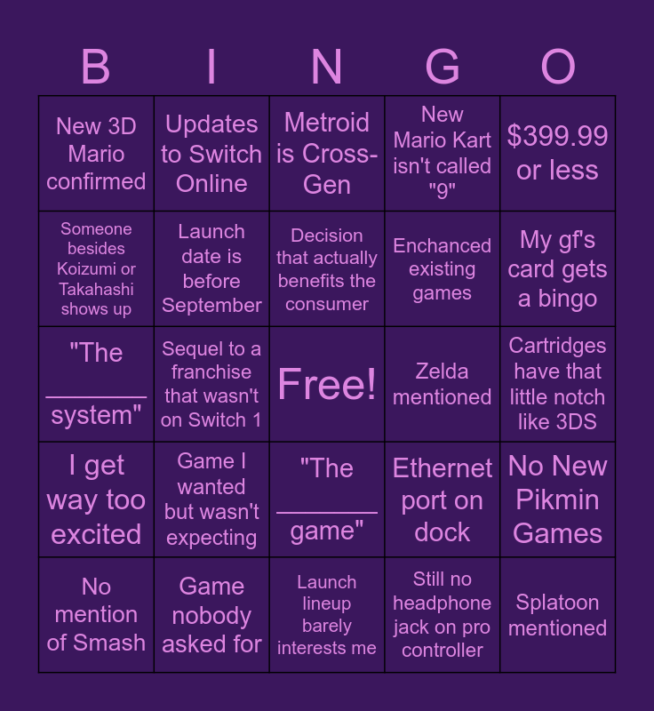 This bingo card has a free space and 24 words: Game I wanted but wasn't expecting, Game nobody asked for, Decision that actually benefits the consumer, No mention of Smash, $399.99 or less, New 3D Mario confirmed, Someone besides Koizumi or Takahashi shows up, Updates to Switch Online, Zelda mentioned, "The _______ game", Enchanced existing games, "The _______ system", Ethernet port on dock, No New Pikmin Games, Launch date is before September, Still no headphone jack on pro controller, Cartridges have that little notch like 3DS, Metroid is Cross-Gen, My gf's card gets a bingo, Sequel to a franchise that wasn't on Switch 1, Splatoon mentioned, I get way too excited, New Mario Kart isn't called "9" and Launch lineup barely interests me.