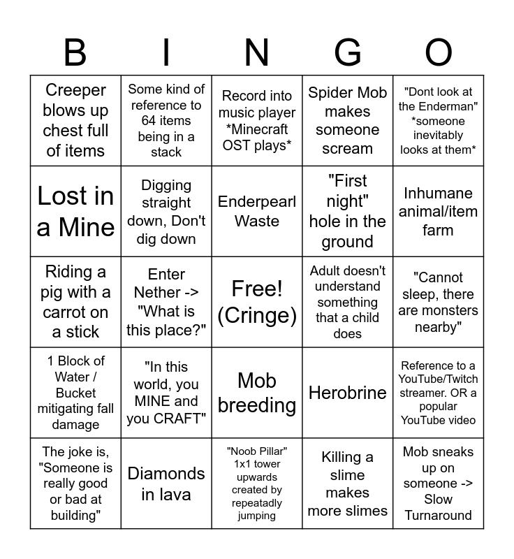 This bingo card has a free space and 24 words: "In this world, you MINE and you CRAFT", Diamonds in lava, Enderpearl Waste, The joke is, "Someone is really good or bad at building", "Dont look at the Enderman" *someone inevitably looks at them*, Creeper blows up chest full of items, Lost in a Mine, Some kind of reference to 64 items being in a stack, Adult doesn't understand something that a child does, Mob breeding, "First night" hole in the ground, Riding a pig with a carrot on a stick, Herobrine, Reference to a YouTube/Twitch streamer. OR a popular YouTube video, Digging straight down, Don't dig down, Killing a slime makes more slimes, "Cannot sleep, there are monsters nearby", Record into music player *Minecraft OST plays*, Inhumane animal/item farm, Enter Nether -> "What is this place?", Mob sneaks up on someone -> Slow Turnaround, 1 Block of Water / Bucket mitigating fall damage, Spider Mob makes someone scream and "Noob Pillar" 1x1 tower upwards created by repeatadly jumping.