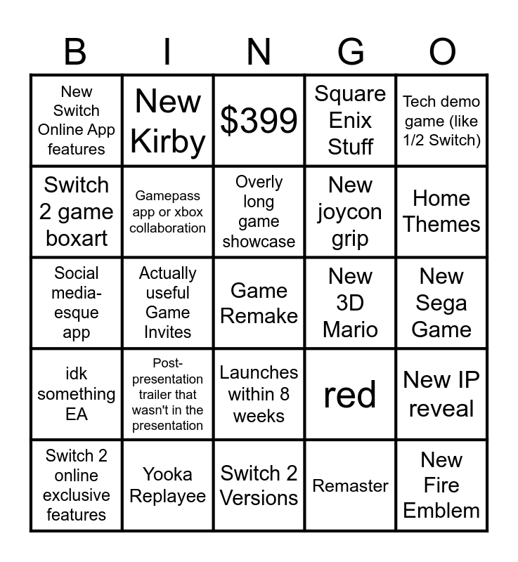 This bingo card has 25 words: Post-presentation trailer that wasn't in the presentation, Switch 2 Versions, Overly long game showcase, Switch 2 online exclusive features, Tech demo game (like 1/2 Switch), New Switch Online App features, Switch 2 game boxart, New Kirby, New 3D Mario, Launches within 8 weeks, New joycon grip, Social media-esque app, red, New IP reveal, Gamepass app or xbox collaboration, New Fire Emblem, New Sega Game, $399, Home Themes, Actually useful Game Invites, Game Remake, Yooka Replayee, idk something EA, Square Enix Stuff and Remaster.