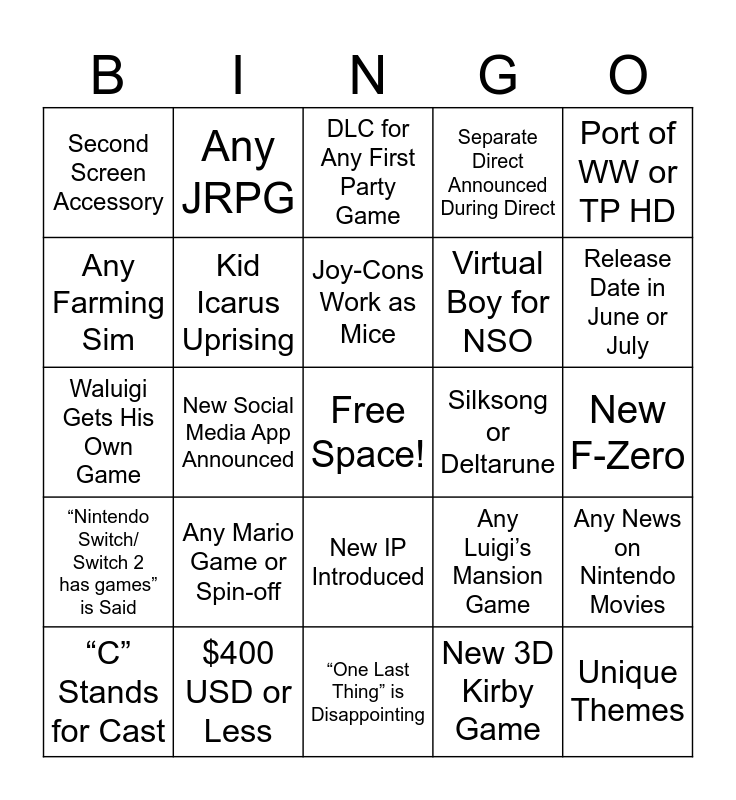 This bingo card has a free space and 24 words: Any Mario Game or Spin-off, $400 USD or Less, Joy-Cons Work as Mice, “C” Stands for Cast, Port of WW or TP HD, Second Screen Accessory, Any Farming Sim, Any JRPG, Silksong or Deltarune, New IP Introduced, Virtual Boy for NSO, Waluigi Gets His Own Game, Any Luigi’s Mansion Game, Any News on Nintendo Movies, Kid Icarus Uprising, New 3D Kirby Game, New F-Zero, DLC for Any First Party Game, Release Date in June or July, New Social Media App Announced, Unique Themes, “Nintendo Switch/ Switch 2 has games” is Said, Separate Direct Announced During Direct and “One Last Thing” is Disappointing.