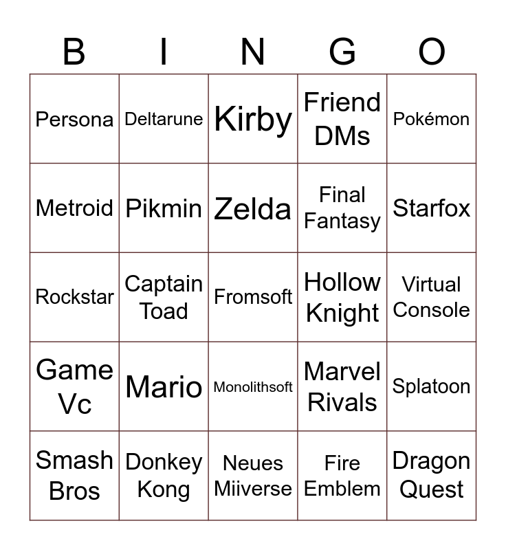 This bingo card has a free space and 24 words: Mario, Donkey Kong, Zelda, Smash Bros, Pokémon, Persona, Metroid, Deltarune, Hollow Knight, Monolithsoft, Final Fantasy, Rockstar, Marvel Rivals, Splatoon, Pikmin, Fire Emblem, Virtual Console, Kirby, Starfox, Captain Toad, Dragon Quest, Game Vc, Friend DMs and Neues Miiverse.