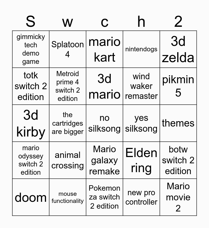This bingo card has a free space and 24 words: animal crossing, mouse functionality, 3d mario, doom, 3d zelda, gimmicky tech demo game, totk switch 2 edition, Splatoon 4, yes silksong, Mario galaxy remake, wind waker remaster, 3d kirby, Elden ring, botw switch 2 edition, Metroid prime 4 switch 2 edition, new pro controller, themes, mario kart, pikmin 5, the cartridges are bigger, Mario movie 2, mario odyssey switch 2 edition, nintendogs and Pokemon za switch 2 edition.
