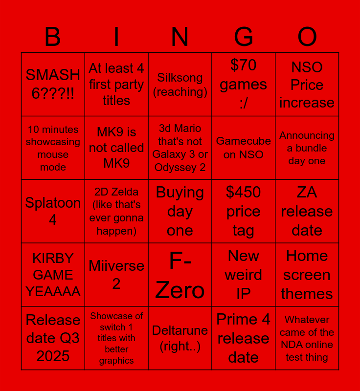 This bingo card has a free space and 24 words: Miiverse 2, Showcase of switch 1 titles with better graphics, 3d Mario that's not Galaxy 3 or Odyssey 2, Release date Q3 2025, NSO Price increase, SMASH 6???!!, 10 minutes showcasing mouse mode, At least 4 first party titles, $450 price tag, F-Zero, Gamecube on NSO, Splatoon 4, New weird IP, Home screen themes, MK9 is not called MK9, Prime 4 release date, ZA release date, Silksong (reaching), Announcing a bundle day one, 2D Zelda (like that's ever gonna happen), Whatever came of the NDA online test thing, KIRBY GAME YEAAAA, $70 games :/ and Deltarune (right..).