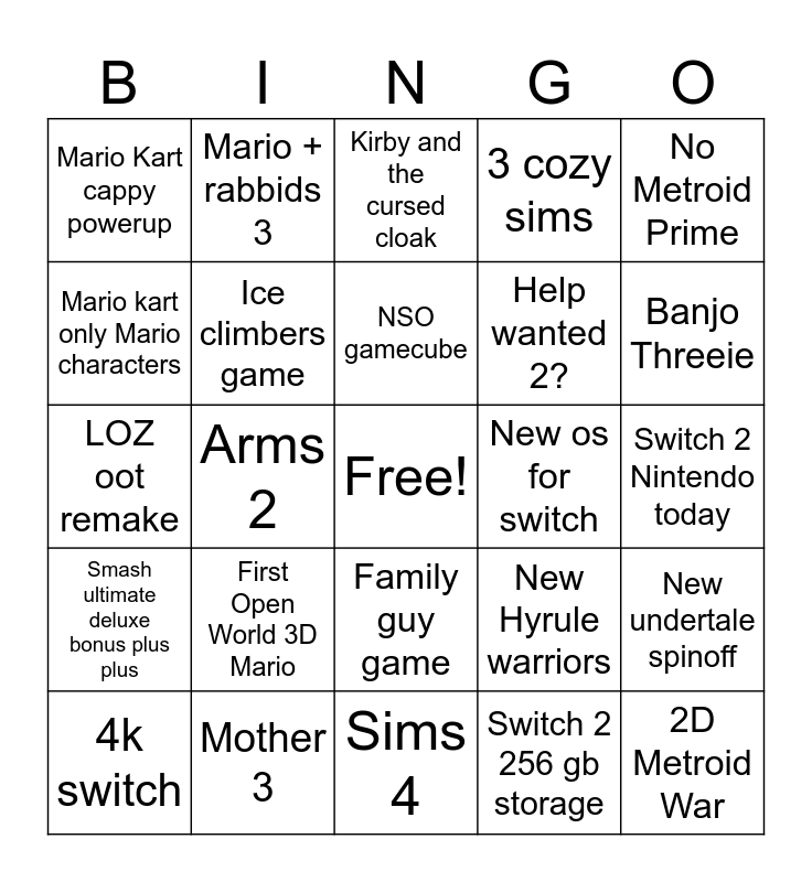This bingo card has a free space and 24 words: First Open World 3D Mario, Mother 3, NSO gamecube, 4k switch, No Metroid Prime, Mario Kart cappy powerup, Mario kart only Mario characters, Mario + rabbids 3, New os for switch, Family guy game, Help wanted 2?, LOZ oot remake, New Hyrule warriors, New undertale spinoff, Ice climbers game, Switch 2 256 gb storage, Switch 2 Nintendo today, Kirby and the cursed cloak, Banjo Threeie, Arms 2, 2D Metroid War, Smash ultimate deluxe bonus plus plus, 3 cozy sims and Sims 4.