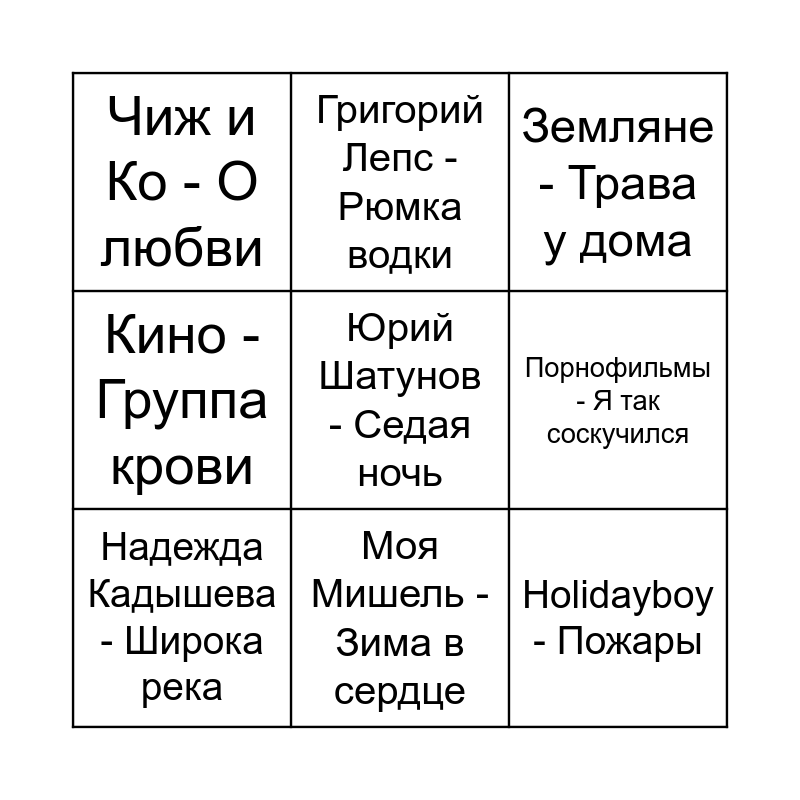 This bingo card has 30 words: Анна Асти - По барам, Отпетые Мошенники - Люби меня люби, Мумий Тролль - Владивосток 2000, ВИА Гра - Попытка 5, Чиж и Ко - О любви, Земляне - Трава у дома, Надежда Кадышева - Широка река, Руки Вверх - Крошка моя, Женя Трофимов - Поезда, Король и Шут - Кукла колдуна, Каста - Вокруг шум, Агутин и Пресняков - Аэропорты, Ленинград - В Питере пить, Максим - Знаешь ли ты, Jakone - Асфальт, Рок острова - Ничего не говори, Татьяна Куртукова - Матушка Земля, Валерий Меладзе - Салют Вера, Jony - Комета, Юрий Шатунов - Седая ночь, Леонид Агутин - Хоп хей, Иванушки - Тополиный пух, Григорий Лепс - Рюмка водки, Holidayboy - Пожары, Порнофильмы - Я так соскучился, Кино - Группа крови, Кар-Мэн - Сан-Франциско, Антон Токарев - Седьмой Лепесток, Моя Мишель - Зима в сердце and Любэ - Конь.