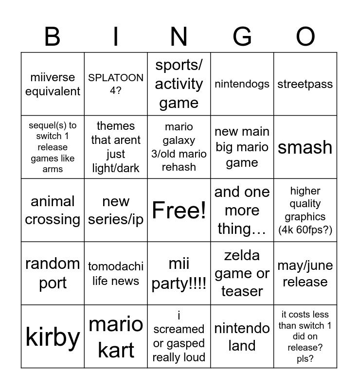 This bingo card has a free space and 24 words: tomodachi life news, mario kart, mario galaxy 3/old mario rehash, kirby, streetpass, miiverse equivalent, sequel(s) to switch 1 release games like arms, SPLATOON 4?, and one more thing…, mii party!!!!, new main big mario game, animal crossing, zelda game or teaser, may/june release, themes that arent just light/dark, nintendo land, higher quality graphics (4k 60fps?), sports/ activity game, smash, new series/ip, it costs less than switch 1 did on release? pls?, random port, nintendogs and i screamed or gasped really loud.