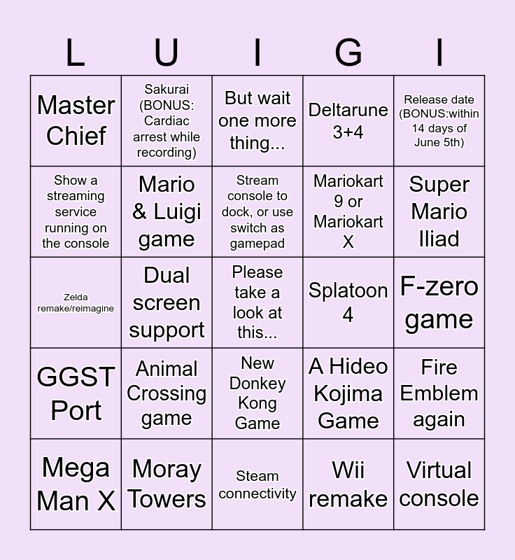 This bingo card has a free space and 24 words: Animal Crossing game, Moray Towers, Stream console to dock, or use switch as gamepad, Mega Man X, Release date (BONUS:within 14 days of June 5th), Master Chief, Show a streaming service running on the console, Sakurai (BONUS: Cardiac arrest while recording), Splatoon 4, New Donkey Kong Game, Mariokart 9 or Mariokart X, Zelda remake/reimagine, A Hideo Kojima Game, Fire Emblem again, Mario & Luigi game, Wii remake, F-zero game, But wait one more thing..., Super Mario Iliad, Dual screen support, Virtual console, GGST Port, Deltarune 3+4 and Steam connectivity.