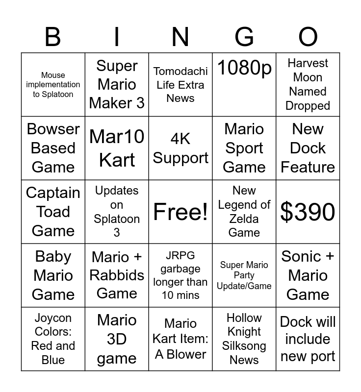 This bingo card has a free space and 30 words: Mario 3D game, Animal Crossing New Game, Updates on Splatoon 3, C Button Does Something Very Stupid, Mouse implementation to Splatoon, Tomodachi Life Extra News, Mar10 Kart, JRPG garbage longer than 10 mins, New Legend of Zelda Game, Mario Kart Item: A Blower, $390, Dock will include new port, Hollow Knight Silksong News, Compared to a different Console, New Dock Feature, GTA 6 News, Super Mario Party Update/Game, Baby Mario Game, Mario + Rabbids Game, Harvest Moon Named Dropped, Captain Toad Game, Yoshi's Wooly World Game, Super Mario Maker 3, Mario Sport Game, Bowser Based Game, 1080p, Sonic + Mario Game, Joycon Colors: Red and Blue, 4K Support and Early May.