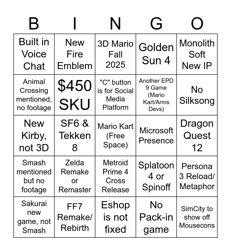 This bingo card has a free space and 24 words: Zelda Remake or Remaster, FF7 Remake/ Rebirth, "C" button is for Social Media Platform, Sakurai new game, not Smash, Monolith Soft New IP, Built in Voice Chat, Animal Crossing mentioned, no footage, New Fire Emblem, Microsoft Presence, Metroid Prime 4 Cross Release, Another EPD 9 Game (Mario Kart/Arms Devs), New Kirby, not 3D, Splatoon 4 or Spinoff, Persona 3 Reload/ Metaphor, $450 SKU, No Pack-in game, Dragon Quest 12, 3D Mario Fall 2025, No Silksong, SF6 & Tekken 8, SimCity to show off Mousecons, Smash mentioned but no footage, Golden Sun 4 and Eshop is not fixed.