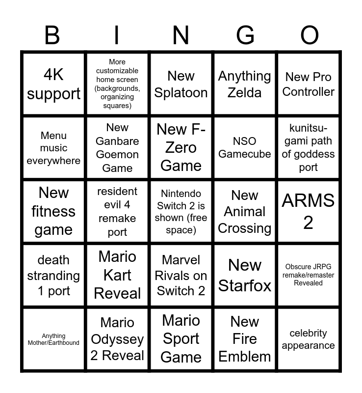This bingo card has a free space and 24 words: Mario Kart Reveal, Mario Odyssey 2 Reveal, New F-Zero Game, Anything Mother/Earthbound, New Pro Controller, 4K support, Menu music everywhere, More customizable home screen (backgrounds, organizing squares), New Animal Crossing, Marvel Rivals on Switch 2, NSO Gamecube, New fitness game, New Starfox, Obscure JRPG remake/remaster Revealed, New Ganbare Goemon Game, New Fire Emblem, ARMS 2, New Splatoon, kunitsu-gami path of goddess port, resident evil 4 remake port, celebrity appearance, death stranding 1 port, Anything Zelda and Mario Sport Game.