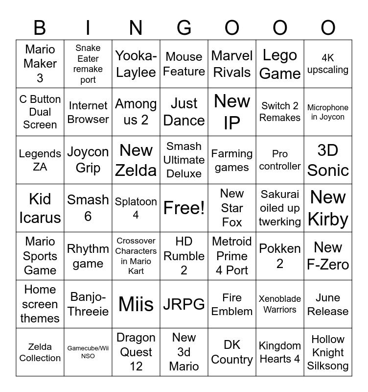 This bingo card has a free space and 48 words: Fire Emblem, Switch 2 Remakes, New 3d Mario, Smash 6, New Zelda, New Kirby, Snake Eater remake port, Gamecube/Wii NSO, Lego Game, HD Rumble 2, 4K upscaling, Mouse Feature, Pro controller, Farming games, Home screen themes, Sakurai oiled up twerking, C Button Dual Screen, Microphone in Joycon, Xenoblade Warriors, Marvel Rivals, New IP, Splatoon 4, Mario Maker 3, Internet Browser, June Release, Among us 2, 3D Sonic, Zelda Collection, Smash Ultimate Deluxe, Joycon Grip, Kingdom Hearts 4, New Star Fox, New F-Zero, Banjo-Threeie, Kid Icarus, Metroid Prime 4 Port, Pokken 2, Legends ZA, Crossover Characters in Mario Kart, Miis, Mario Sports Game, Hollow Knight Silksong, Yooka-Laylee, Dragon Quest 12, Just Dance, JRPG, Rhythm game and DK Country.