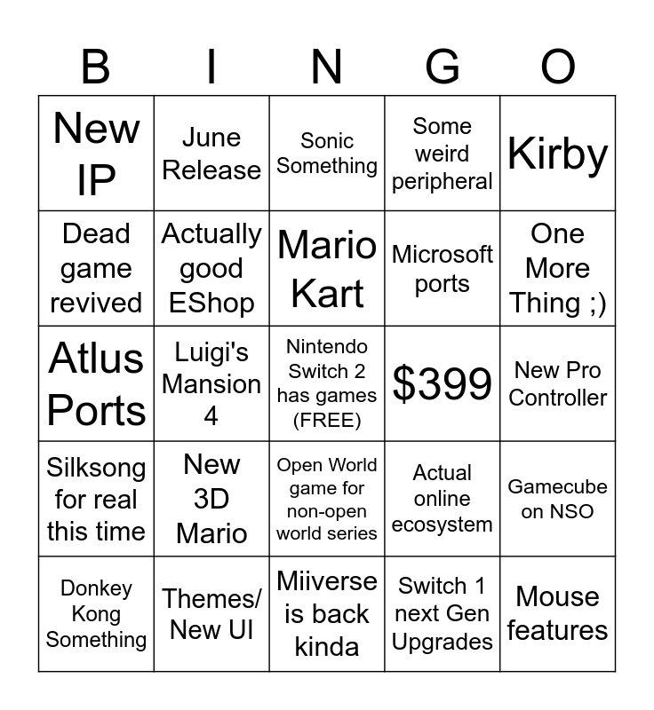 This bingo card has a free space and 24 words: New 3D Mario, Themes/ New UI, Mario Kart, Donkey Kong Something, Kirby, New IP, Dead game revived, June Release, $399, Open World game for non-open world series, Microsoft ports, Atlus Ports, Actual online ecosystem, Gamecube on NSO, Actually good EShop, Switch 1 next Gen Upgrades, New Pro Controller, Sonic Something, One More Thing ;), Luigi's Mansion 4, Mouse features, Silksong for real this time, Some weird peripheral and Miiverse is back kinda.